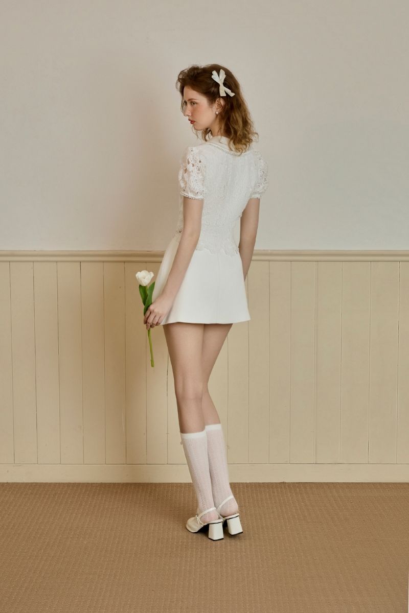 Áo ren trắng cao cấp, họa tiết hoa tinh xảo, cổ sen mềm mại viền ngọc trai nhẹ nhàng. Tay phồng nhẹ tạo cảm giác cổ điển mà không kém phần hiện đại.